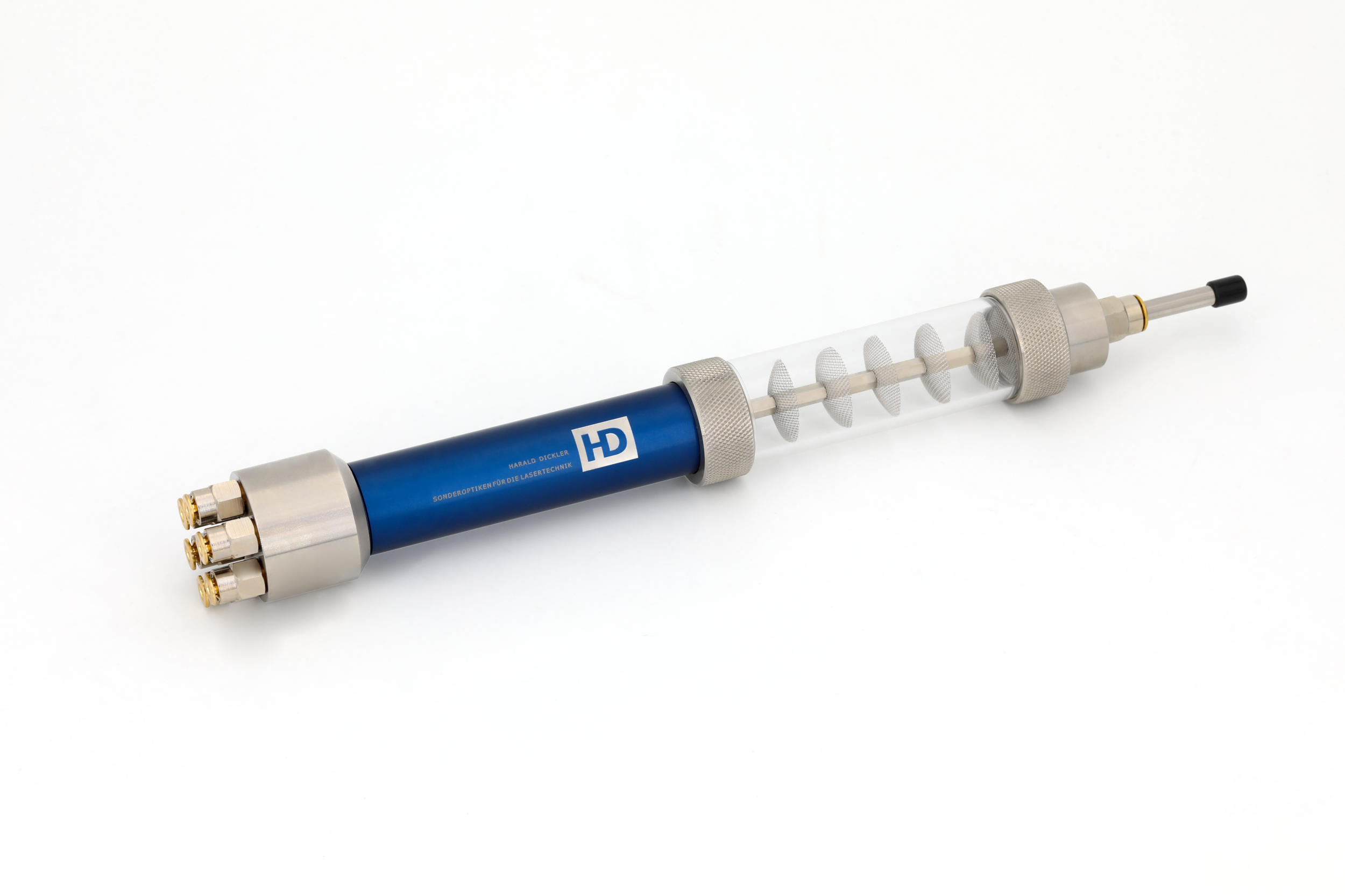 Der Pulververteiler wird verwendet, um die Pulverdüsen mit der Pulverzuführung zu verbinden. Dabei teilt er den Pulvergasstrahl, der den Pulverförderer verlässt, in homogene Teilstrahlen auf. Der Verteiler ist modular aufgebaut, d. h. die Ein- und Ausgänge sind je nach Kundenwunsch kombinierbar.Durch den Einsatz eines Kerns aus mehreren Diffusorblechen in einem definierten Abstand wird eine gleichmäßige Verteilung realisiert. Zusätzlich sorgt diese Komponente dafür, dass bei hohen Pulvermassenströmen eine nahezu puls-freie Förderung vorliegt. Über einer zusätzlichen Klemmvorrichtung kann er relativ leicht an eine Anlage integriert werden.